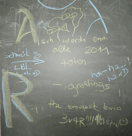 auf dem rueckweg habe ich im eingangsbereich ein offenes klassenzimmer vorgefunden und die massive anonyme drohung >>>ich werde euch alle 2011 toeten<<< , auf die schultafel mit