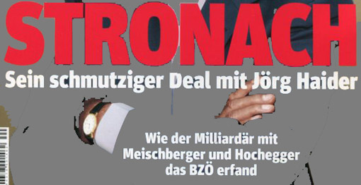 Stronik / Stronak / Stronach hat die erste Huerde genommen. 5 Abgeordnete hat er sich mit dem Scheckbuch geangelt und fordert nun vom Praesidium den Klubstatus. Der Mann beleidigt auf seine unverfrorene Art das Parlament. Er redet nicht von Quatschbude, er hat sich Abgeordnete eingekauft, so wie andere im Supermarkt guenstige Bier-& Schnapsflaschen kaufen. Das ist ein schleichender Putsch, der nicht aus dem steirischen Vulkanien sondern aus der Kaelte kommt. Was der will der Mann ? Die Demuetigung der Demokratie ? Ersetzt durch MAGNA Diktat ? Man muss ihn aufhalten, Stronach schafft keine neuen Werte, er verhoehnt die Grundlagen.