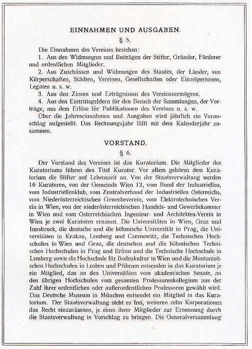 Einem interessanten Zufall ist die Gruendung des Technischen Museums zu verdanken. Man wollte in Wien im Jahre 1908 eine technische Ausstellung veranstalten, als Ministerialrat Dr.Brosche den glaenzenden Einfall hatte und auch den Mut hatte, an Stelle der Ausstellung, unter Benuetzung der zur Verfuegung gestellten Summe und durch Hinzuziehung einer Reihe von bedeutenden Maennern der oesterreichischen Industrie (A.Krupp, Hugo von Noth, Georg Guenther usw.), denen damals sehr reiche Mittel zur Verfuegung standen und die auch bedeutenden Einfluss hatten, das Technische Museum zu schaffen. Als Vorbild diente ihm das im Jahre 1905 in Muenchen errichtete Deutsche Museum. Der Gedanke der Gruendung stammte freilich schon von frueher her, ich selbst habe seit dem Ausstellungsjahr 1873 fuer die Verwirklichung dieses Planes durch Sammlungen und Propagandaarbeit den Weg geebnet.